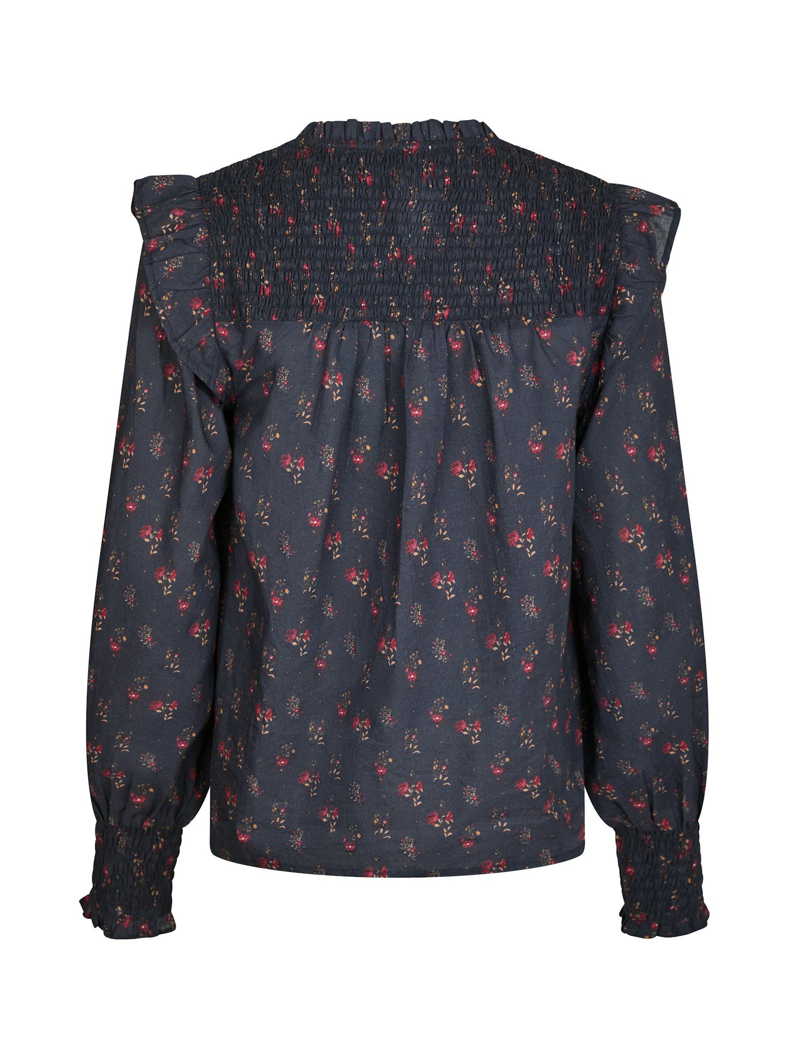 Søt bluse i et fint blomstermønster. Blusen har volangdetaljer ved halsen og ermene, samt strikk nederst på ermene og bak på ryggen. Modellen er 176 cm høy og har på seg størrelse 36.