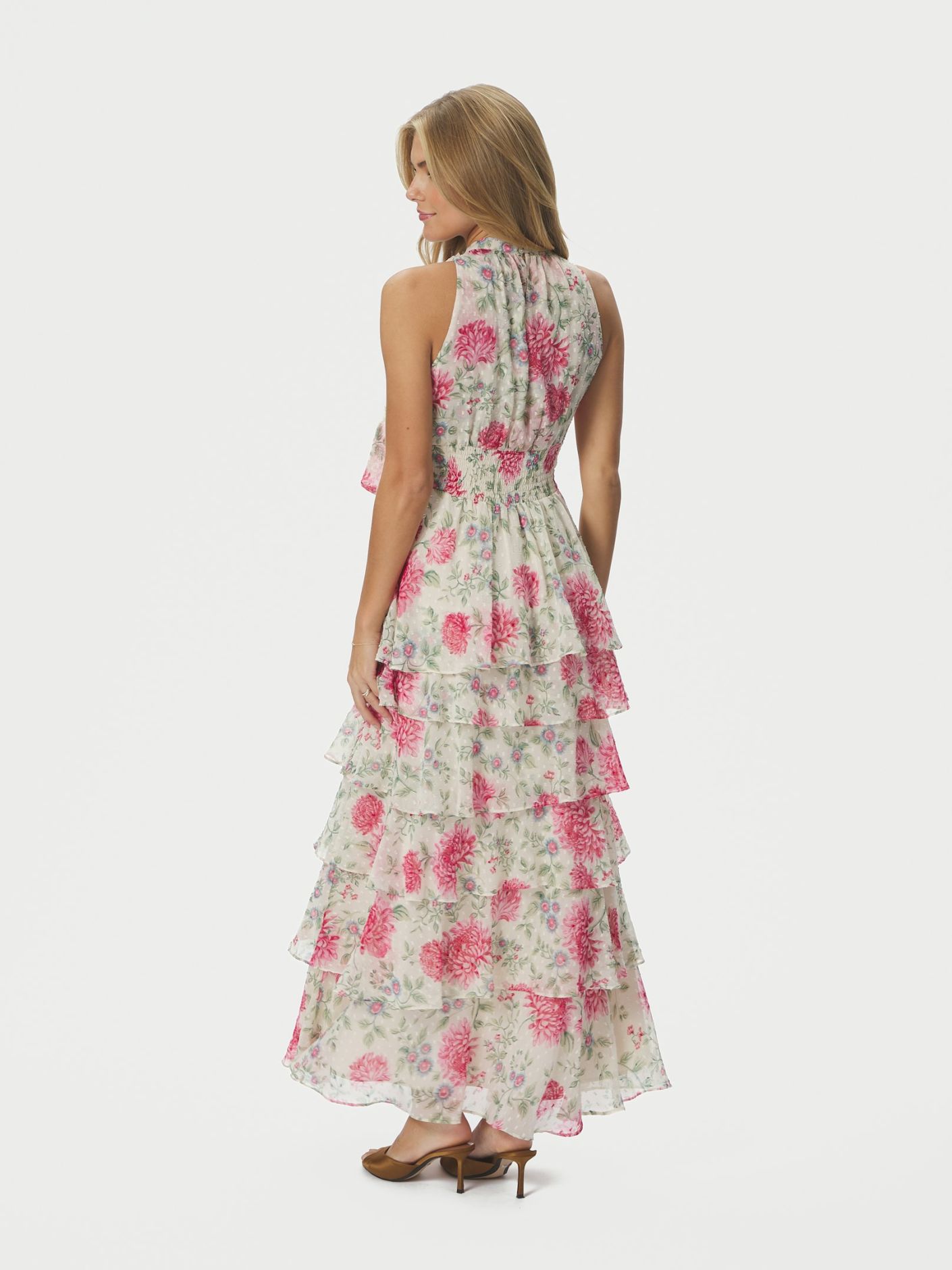 Lang blomsterkjole som knytes i nakken. Kjolen har strikk under bysten og en løs skjørtdel nederst. Modellen er 176 cm høy og har på seg størrelse 36.