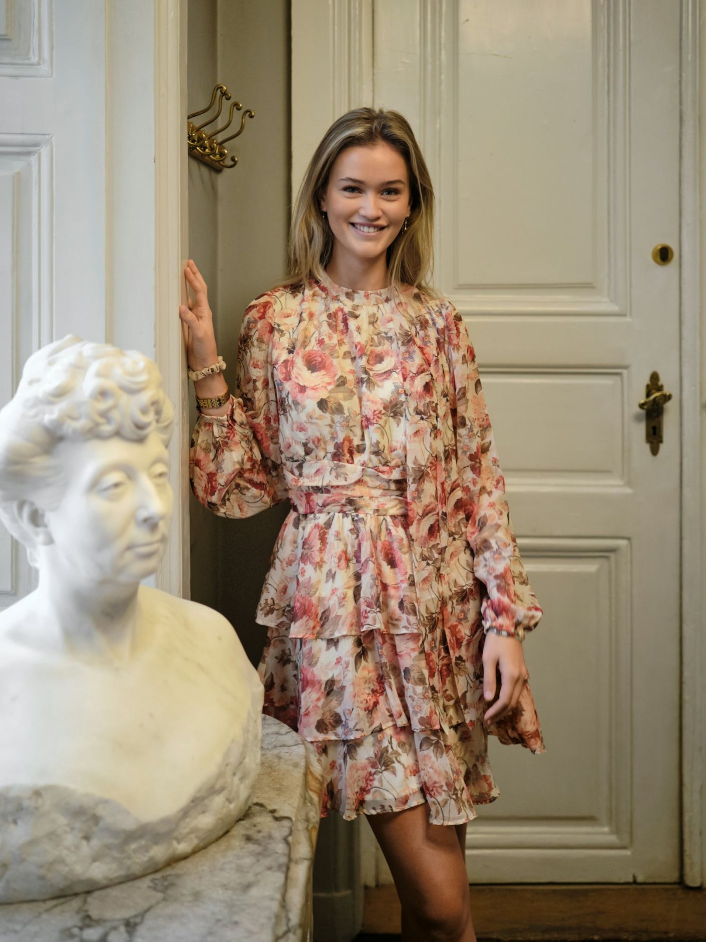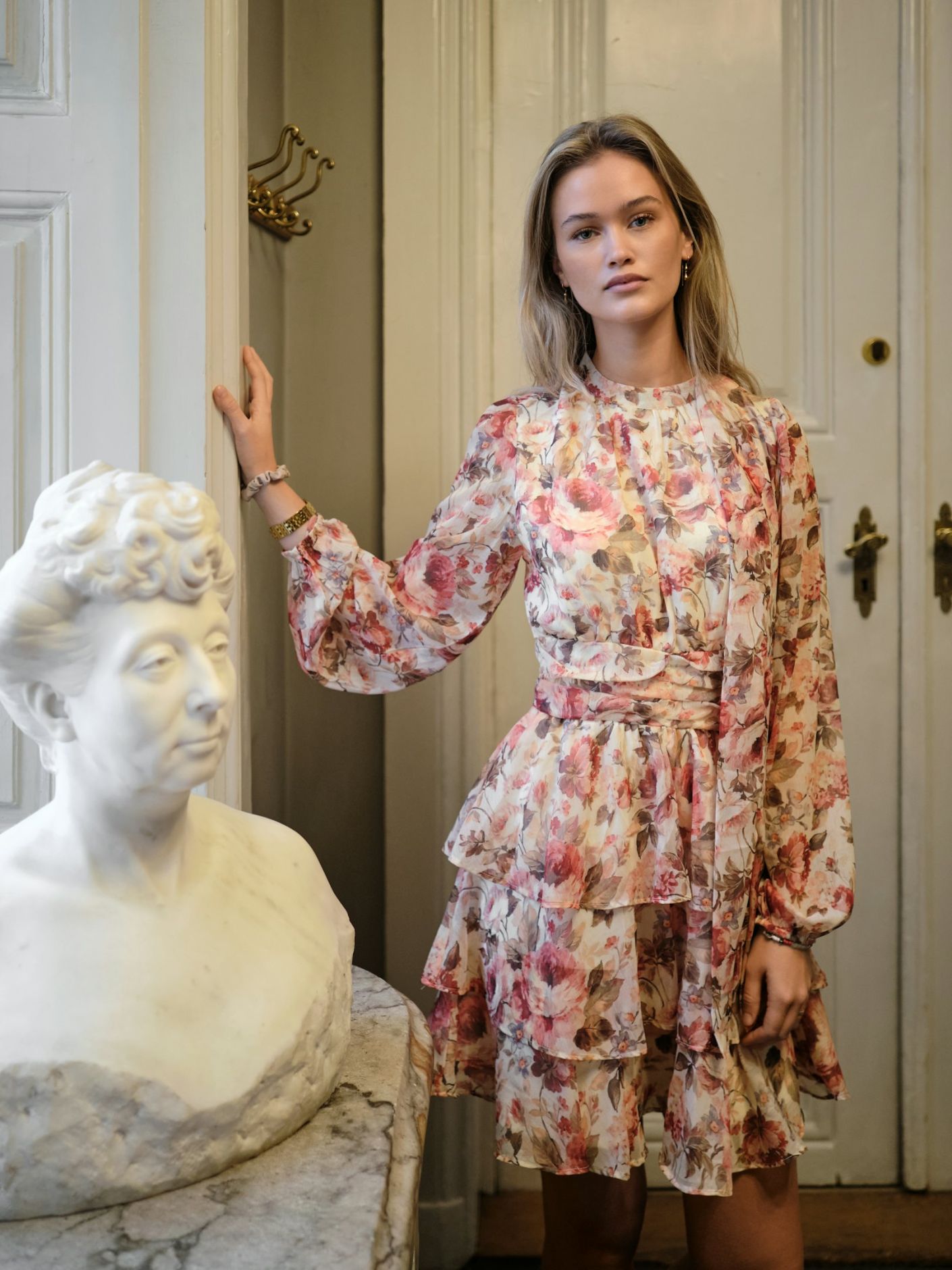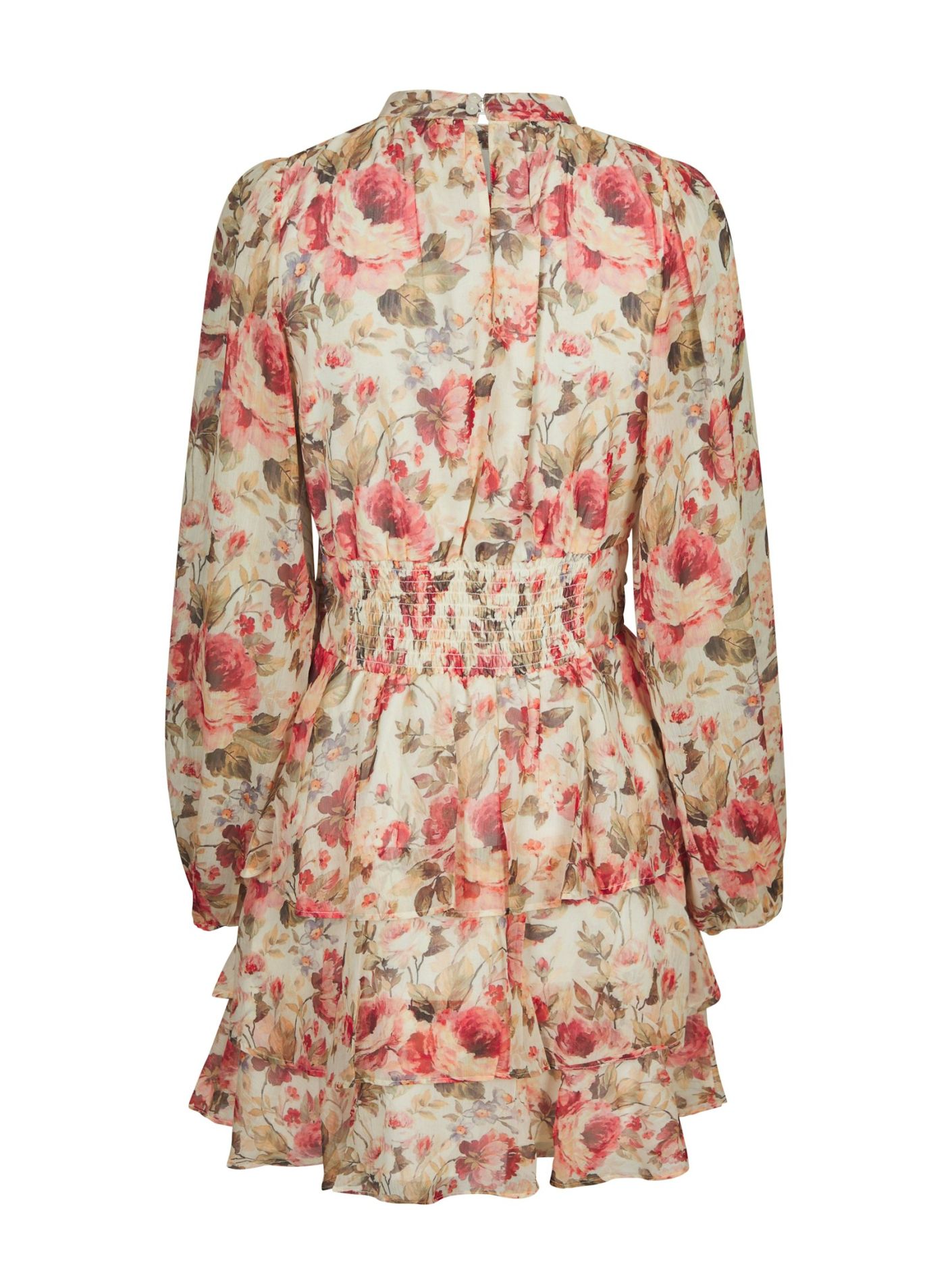 Søt kort kjole med høy hals, lange løse ermer og volangskjørt. Kjolen har et blomstermønster. Modellen er 176 cm høy og bruker størrelse 36.