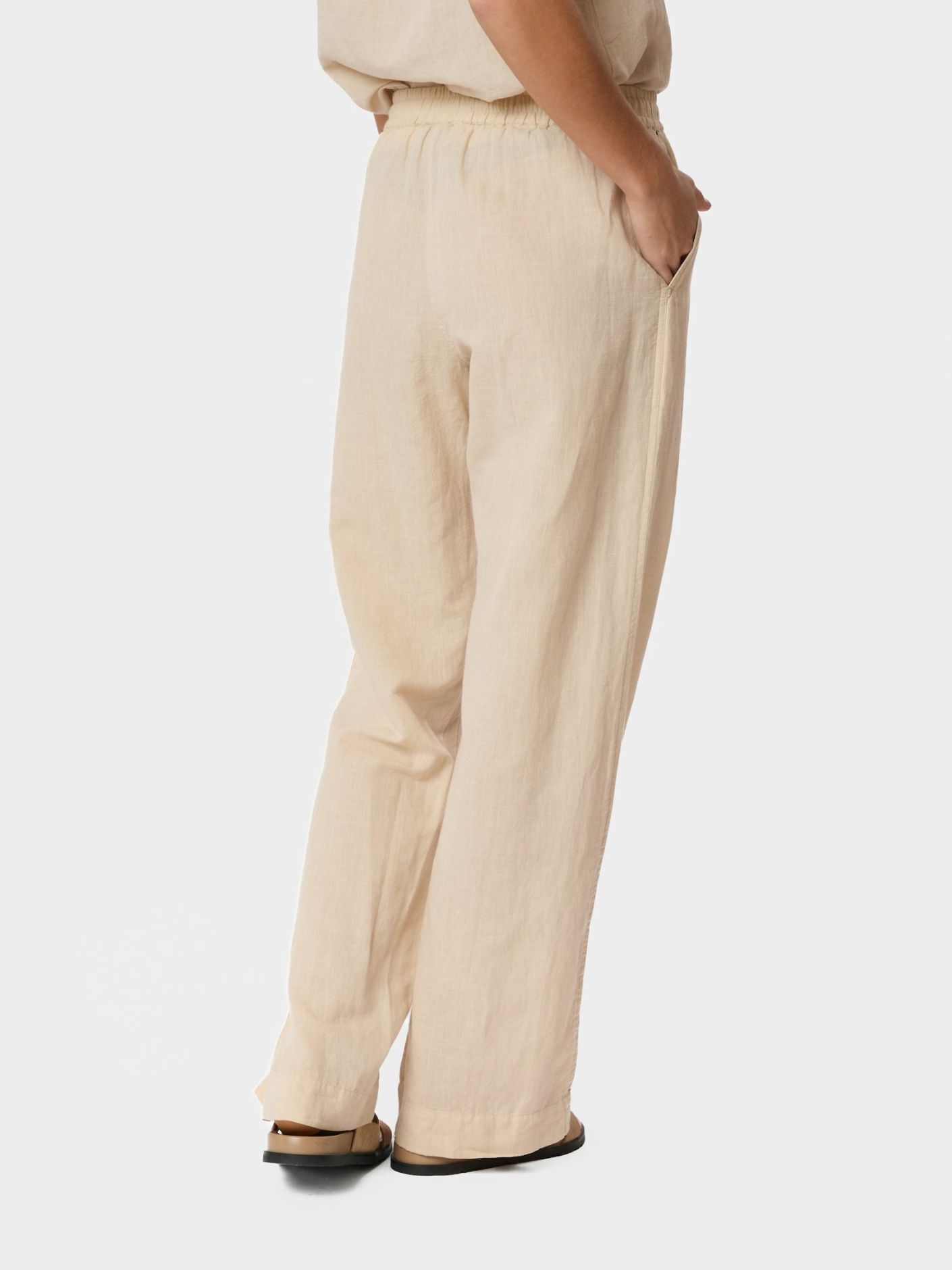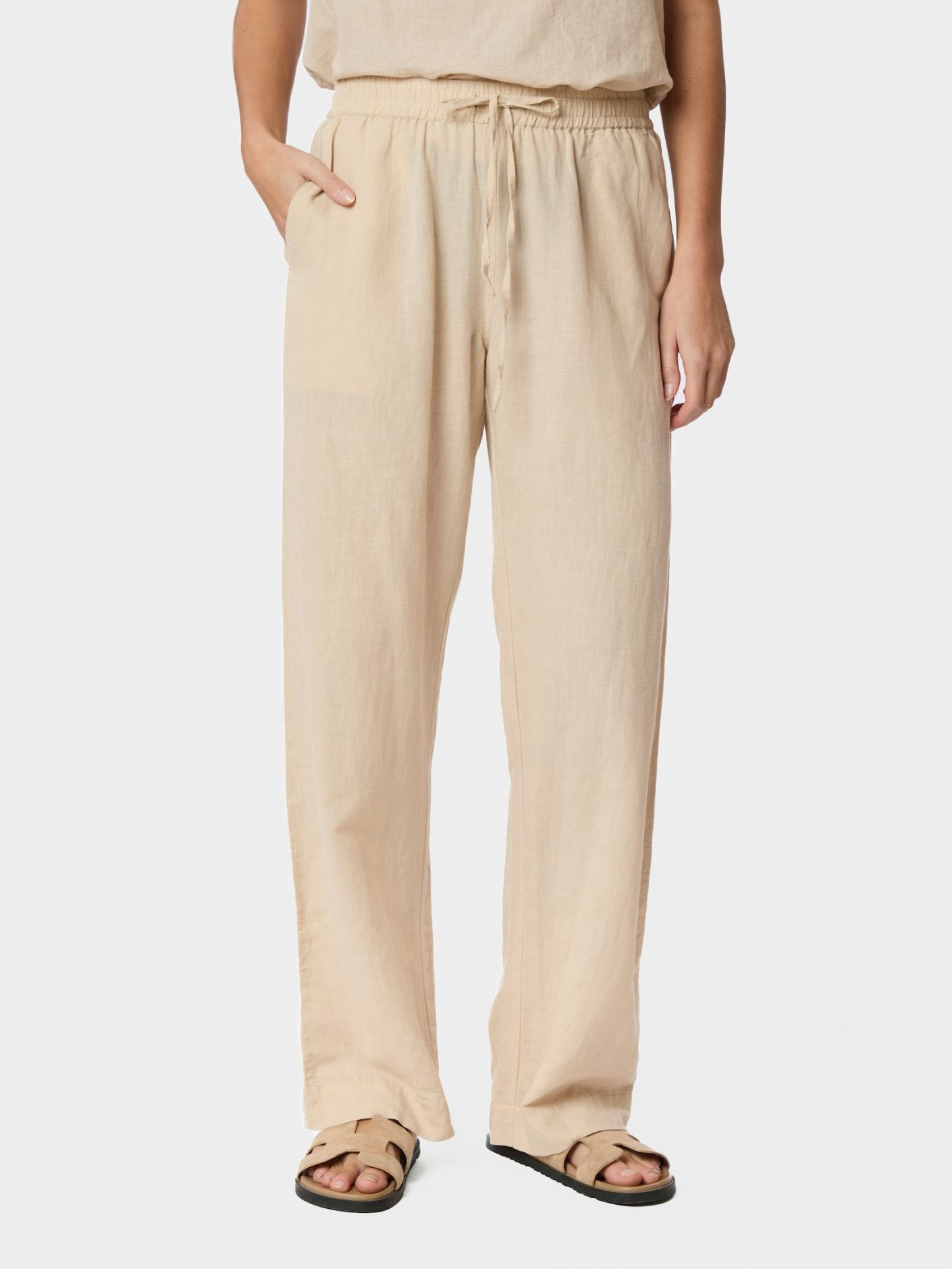 Uformelle og kule bukser i linblanding med vide ben og elastisk strikk og snøring i livet. Buksene har lommer foran.