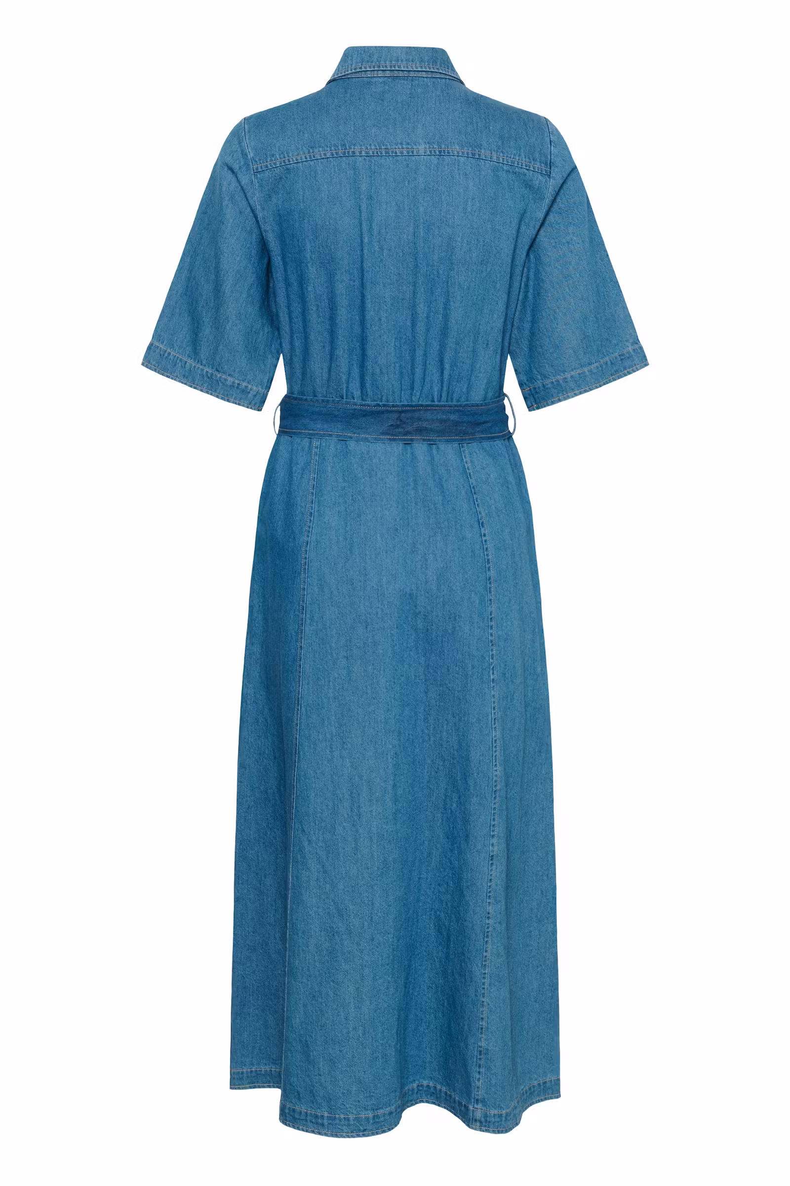 Yes please! Superfin kjolenyhet fra Part Two. Denimkjole med rett fasong, skjortekrage og midi-lengde. Trykknapper foran, korte ermer og brystlommer. Belte i livet gir markert silhuett.